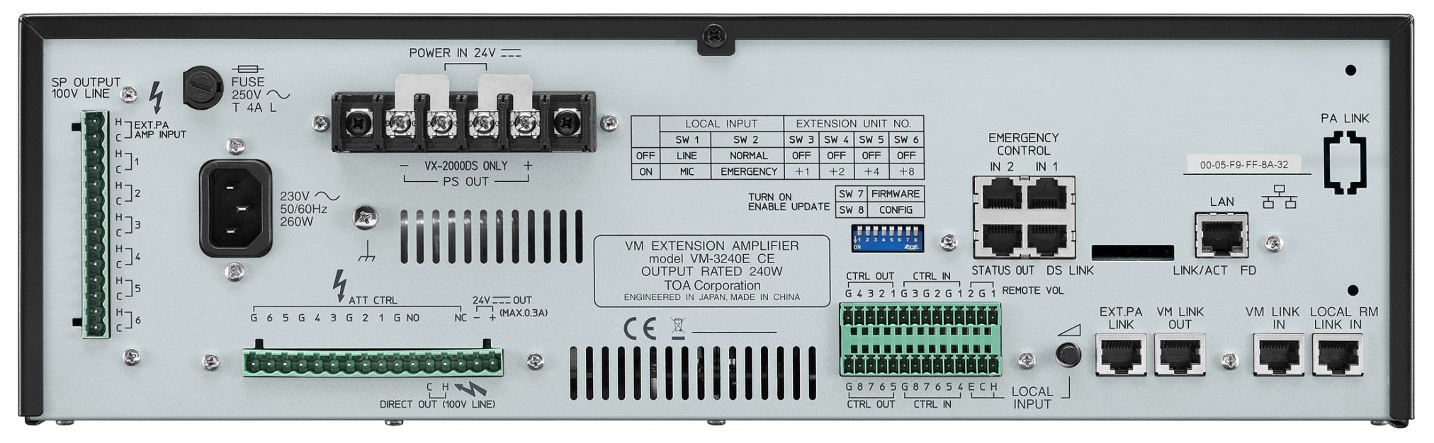 VM-3240E là bộ khuếch đại đa chức năng có thể được gắn trong giá thiết bị EIA-Standard (3-U). Thiết bị đi kèm với phần đầu ra loa có bộ suy giảm bên trong và bộ chọn 6 đầu ra. Ngoài ra, thiết bị có chức năng giám sát tự động kiểm tra hệ thống để tìm lỗi.